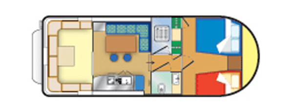 - Salon/Küche mit Essecke (Umbaumöglichkeit zu Doppelbett) und Führerstand