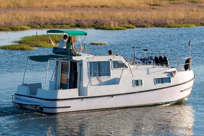 Die Boote des Typs New Concorde Fly sind solide Boote mit einem guten Preis-Leistungs-Verhältnis. Die drei Modelle Suite, First und Twins unterscheiden sich lediglich in der Aufteilung der Schlafkabinen bzw. der Anzahl der Badezimmer. Der schön gestaltete Salon mit Führerstand, Küche und Sitzecke, die bei Bedarf in ein weiteres Doppelbett umgebaut werden kann, sind auf allen Booten identisch. Von hier aus gelangen Sie auch über die verglaste Schiebetür zur Terrasse im Heck und weiter zum höher gelegenen zweiten Steuerstand im Freien. Die New Concorde Fly Suite besitzt im Schiffsbug eine Kabine mit einem Doppelbett und einem Einzelbett. Daneben gibt es ein Badezimmer mit Dusche und eine separate Toilette.