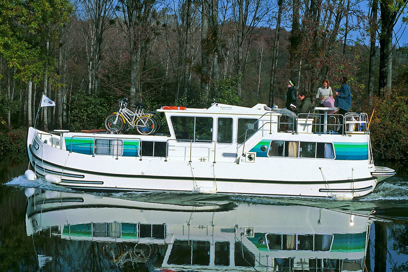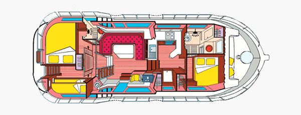 Die Pénichette 1165 FB bietet Platz für bis zu sieben Personen und punktet mit der breiten und komfortablen Flying-Bridge mit zweitem Steuerstand, festem Tisch und Sitzbank. An Bord gibt es insgesamt drei Kabinen: zwei Kabinen mit je einem Doppelbett sowie eine mit zwei Etagenbetten im Heck. Bei Bedarf kann die Sitzbank im Salon zu einem weiteren Einzelbett umgewandelt werden. Darüberhinausgehend finde Sie an Bord zwei Badezimmer mit Dusche und elektrischem WC, eine gut ausgestattete Küche sowie den großen Salon. Für gute Unterhaltung sorgen ein Radio und CD-Spieler. Als besondere Ausstattung sind zusätzlich eine Warmwasserzentralheizung, ein Landstromanschluss und ein Bugstrahlruder vorhanden, das ein noch einfacheres Navigieren des Bootes zulässt.