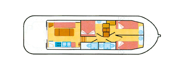 Die Pénichette 1260 besticht durch ihren erhöhten Steuerstand im hinteren Drittel des Bootes, der eine hervorragende Übersicht und permanenten Kontakt zu den Mitfahrern drinnen und draußen erlaubt. Das Boot verfügt über drei Kabinen mit Doppelbetten, wobei in den beiden Bugkabinen auf Wunsch ein weiteres Einzelbett in halber Höhe eingehängt werden kann. Zwei weitere Schlafplätze können bei Bedarf durch die Umwandlung der Sitzbank im Salon zu einem Doppelbett geschaffen werden. Weitere Highlights sind der große Salon mit zwei Schiebedächern, die breite Terrasse im Heck mit Überdach und das große Sonnendeck. Für gute Unterhaltung sorgen ein Radio und CD-Spieler.
