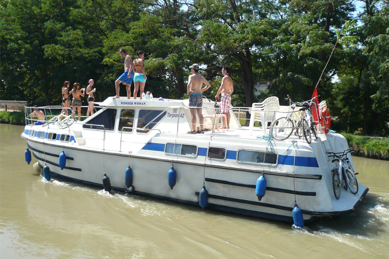 Die Tarpon 42 Trio Prestige ist mit ihren drei Schlafkabinen idealerweise für sechs Personen geeignet. Durch Umwandlung des Essbereichs im Salon in ein Doppelbett können zwei weitere Personen einen Schlafplatz finden. Die vordere Kabine ist mit einem Doppelbett ausgestattet, die beiden hinteren mit je zwei Einzelbetten, die auf Wunsch in ein Doppelbett umgebaut werden können. Insgesamt befinden sich an Bord je drei Duschen und elektrische Toiletten. Zusätzlichen Komfort bietet die Klimaanlage (außer in Deutschland) sowie der Landstromanschluss und das Bugstrahlruder, das ein noch einfacheres Navigieren zulässt. Für gute Unterhaltung sorgt zudem ein Radio mit CD-Spieler. Im Außenbereich befindet sich neben der Terrasse mit zweitem Steuerstand auch ein großes Sonnendeck, von wo aus Sie den tollen Blick auf die Flusslandschaft genießen können.