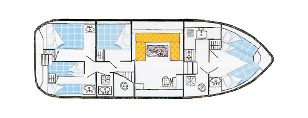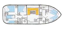 Die Tarpon 42 ist optimal für große Gruppen geeignet und verfügt über insgesamt vier Kabinen und zwei Badezimmer mit Dusche und WC. Zwei Kabinen verfügen jeweils über drei Einzelbetten und zwei Kabinen über Doppelbetten. In der Mitte des Bootes liegt neben der separaten, gut ausgestatteten Küche der großzügige Salon mit Innensteuerstand und Sitzecke, die bei Bedarf in ein zusätzliches Doppelbett umgewandelt werden kann. Im Außenbereich befindet sich neben der Terrasse mit zweitem Steuerstand auch ein großes Sonnendeck, von wo aus Sie den tollen Blick auf die Flusslandschaft genießen können.