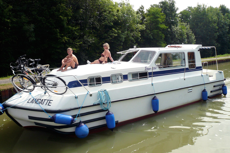 Die Triton 1050 verfügt über insgesamt zwei Kabinen sowie eine Dusche und eine Toilette. Die beiden Kabinen sind mit Doppelbetten ausgestattet, die vordere Kabine zusätzlich noch mit einem Einzelbett. Weiter Schlafmöglichkeiten gibt es im Durchgang in der Mitte, wo sich ein Einzelbett befindet sowie durch die Umbaumöglichkeit der Sitzecke im Salon zu einem weiteren Doppelbett. Im Wohnbereich befinden sich die Küche, der Salon mit Essbereich und der Steuerstand. Von hier aus gelangt man durch die verglaste Schiebetür im Heck zur Terrasse mit Sonnensegel.