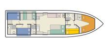 Die Eagle bietet auf einer Länge von knapp 14 m Platz für bis zu 12 Personen und verfügt über vier Schlafkabinen. Die beiden hinteren Kabinen sind jeweils mit einem Doppelbett ausgestattet, die vordere mit zwei Einzelbetten und die seitliche mit zwei übereinander liegenden Einzelbetten. Vier weitere Schlafplätze können im Wohnbereich durch Umwandlung der beiden Sitzecken in Doppelbetten geschaffen werden. An Bord befinden sich insgesamt drei Badezimmer mit Duschen und Toiletten. Der Wohnbereich beinhaltet neben den Sitzecken noch die Küche und den Führerstand. Von hier aus gelangen Sie auch auf die geräumige Terrasse mit zweitem Steuerstand, so dass Sie jederzeit die Sonne genießen können.