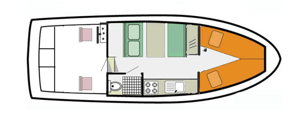 Die Navig 27 ist das ideale Boot für zwei Personen. Die Schlafkabine im Schiffsbug ist mit zwei Einzelbetten möbliert. In der Schiffsmitte befindet sich neben dem Badezimmer mit Dusche und Toilette der Salon mit gut ausgestatteter Küche und Essbereich, der bei Bedarf in ein weiteres Einzelbett umgewandelt werden kann. Gesteuert wird die Navig 27 vom Hinterdeck mit abnehmbarer Plane aus.