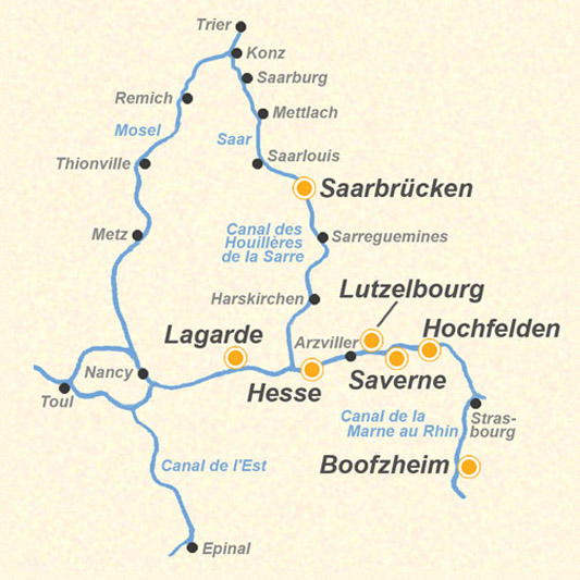 Der Canal de la Marne au Rhin verbindet ab Vitry le François in der Champagne Paris mit dem Rhein. Auf dem Weg von Lothringen ins Elsass passiert man so bedeutende Städte wie Toul und Nancy. Diese Stadt an der Mosel ist das Handels- und Kulturzentrum Lothringens, die einstige Residenz der Lothringer Herzöge. Nancy besticht vor allem durch großzügige Anlagen und herrliche Plätze, die nach französischer Art ganz auf perspektivische Wirkung angelegt sind. Als Kulturstadt mit weitem Wirkungskreis ist Nancy aus architektonischer Sicht besonders wegen vieler Jugendstilbauten bekannt. Auf dem Weg gen Osten durchfährt man ab Lagarde den Nationalpark Lorraine, der den Hausbooturlauber auch durch die Seen von Réchicourt und Gondrexange führt, an welchen auch vielfältige Wassersportmöglichkeiten angeboten werden. Von Gondrexange zweigt der Canal des Houillères de la Sarre, der alte Kohlen-Saar-Kanal, in nördliche Richtung ab zu den Orten Sarralbe und Sarreguemines (Saargemünd) bis zur deutsch-französischen Grenze und über diese hinaus bis nach Saarbrücken. Folgt man der ursprünglichen Richtung weiter, gelangt man bald zu einem Höhepunkt der Kanalschiffahrt: dem Schrägaufzug von Arzviller, der in Europa einzigartig ist. Er überwindet einen Höhenunterschied von 44,55 m und ersetzt dabei 17 Schleusen.