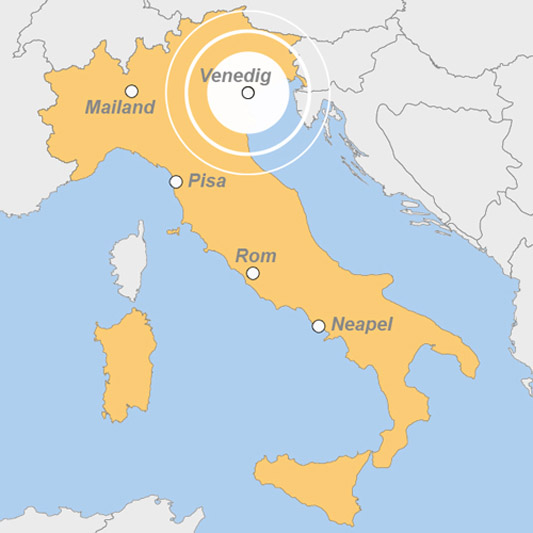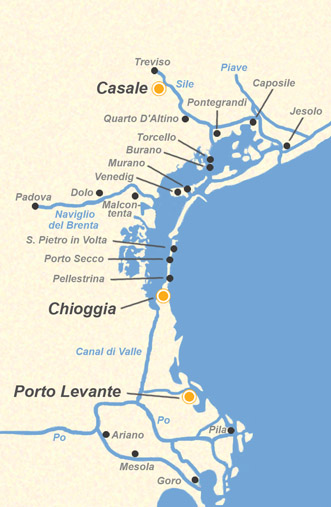 Insgesamt über 80 kleine Inseln befinden sich innerhalb der venezianischen Lagune, von denen man einige nicht verpassen sollte, so zum Beispiel Murano, die für ihre Glasbläserkunst bekannt ist. Auf der Fahrt über den Fluss Sile gelangen Sie nach Treviso. Eine Eigenart dieser Stadt sind die bemalten Fassaden von Palästen und Wohnhäusern aus verschiedenen Zeiten.